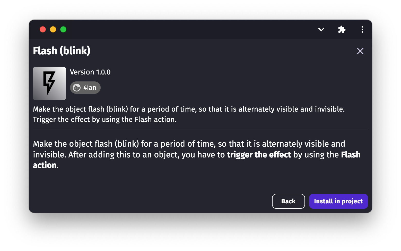 The description usually explains how to use the extension. Here, it is a behavior that you can add to an object, with an action to make the object flash for a bit of time (like in old platformer, when you are hit by an enemy).