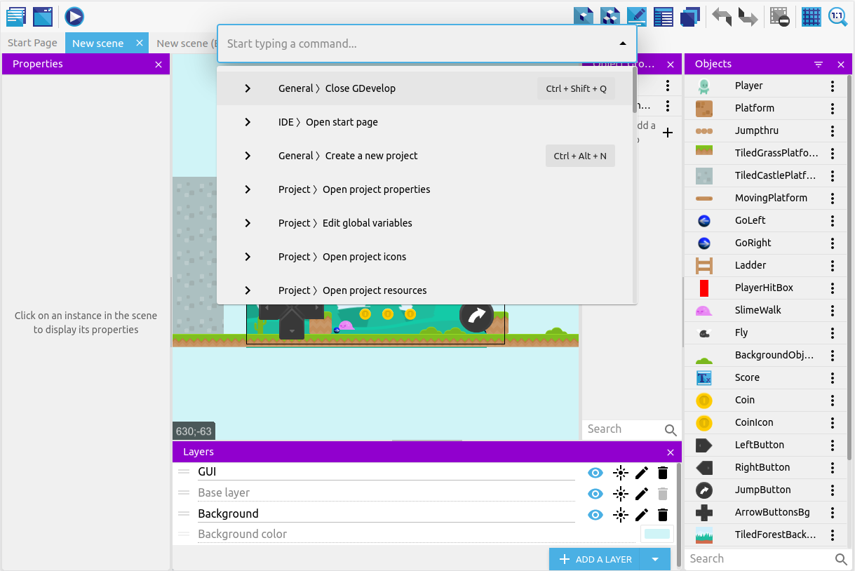 GDevelop provides keyboard shortcuts that allow you to quickly get to places. You can customize them to fit your preferences.