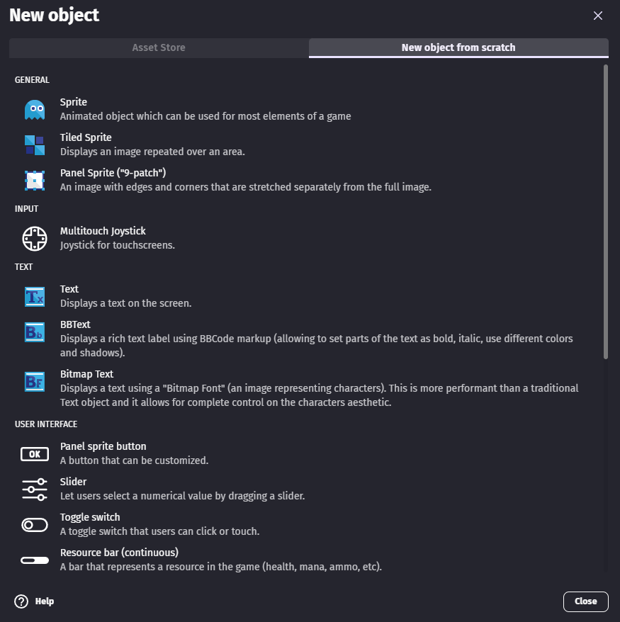 You can create different types of objects for different purposes. For example, Sprite objects add animated graphics to a game, while Text objects add text to a game.