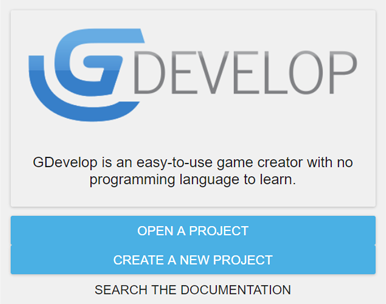 It is advised to always check the above page for the latest versions of GDevelop and keep the software updated at all times. Once you have downloaded and installed the software, when you launch the program, you will be welcomed with a "Start" screen.