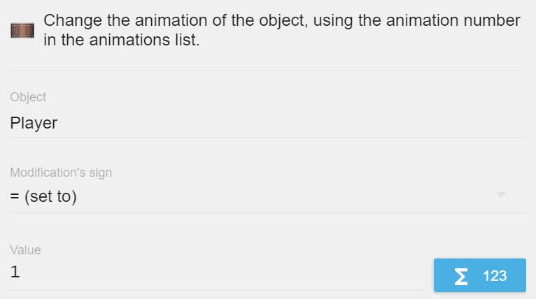 Note that the Object should be set to Player as we want the player to perform the action. Now we also want the jump animation to play while the Player Sprite jumps. To do this we add another action for the same event condition. Click on Add an action->Sprite->Animation and images->Change the animation and set it as shown. Note that instead of using identifier numbers, you can also use the animation name. To refer to animations using their name, you should use the Change the animation (by name) option instead. The name should be within quotes.