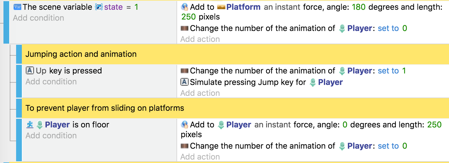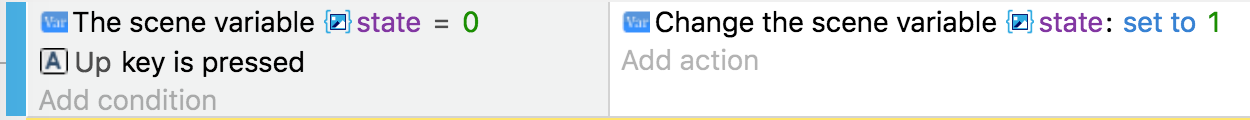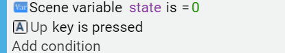 Hint: For the first condition, we need to check the value of the scene variable state. Click on Add a condition→Variables→Value of a scene variable. Set it to check if the value is equal to 0. For the second condition, Add a condition->Keyboard->Key pressed, then set it to check for the Up key. tip