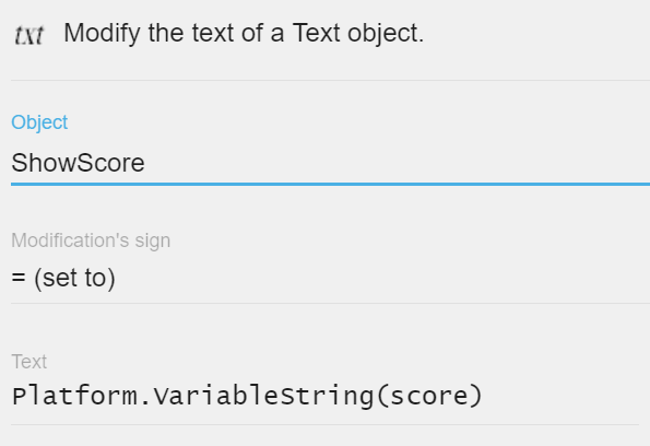 Once we are back to that particular event, click Add an Action->Text Object->Modify the text. Now look very carefully at the image shown below. Now, the text object has a value of String type but our score variable stores number values. We need to use a library function here to convert that Integer to String and then update the text of the Text object.