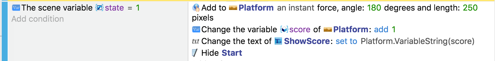 Hint: In the event where we specified a force for the Platform to move, we will now add a condition. Click Add a condition->Variables->Value of a scene variable. Set it to check if the value is equal to 1.tip