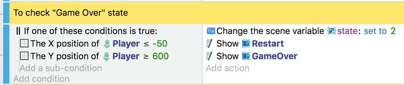 Now, let's understand what we did here. The condition we added specifies a rule such that if even one of the sub-conditions is true, then the action associated with this event will be executed. Since the game ends if he falls down (Y position) or gets pushed outside the screen(X position), so we check for the X position and the Y position.