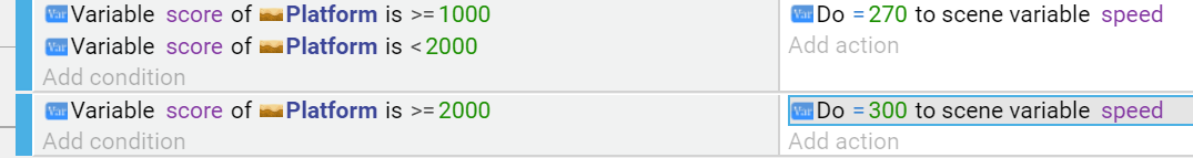 Now, we want to check the value of the object variable score, and change the value of the scene variable speed accordingly. Add new events and specify the conditions to increase the speed of the platforms. An example is shown below:
