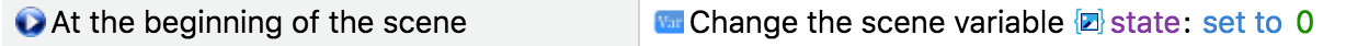 Next, Add an action->Variables->Value of a scene variable. Then name your variable something, state for example and set it to 0. This sets the game to the initial pre-game state at the start of the scene.