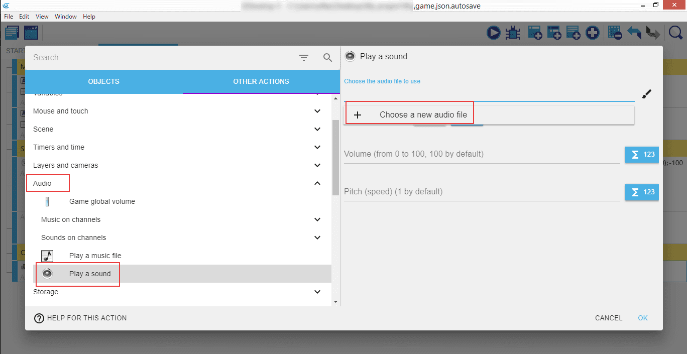 It will open a popup where you'll be able to choose and load an audio file that will be played when the shape will be collected by the Monster. For us, it's called monster.wav.