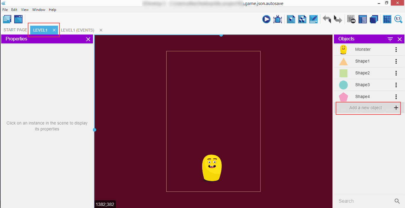 Now switch to the "Level1" tab, find the "Score" object in the right panel, and drag it onto the scene.