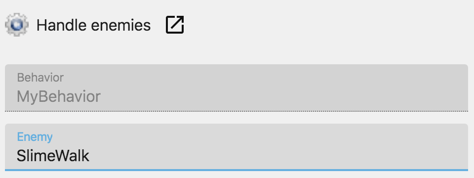 In the scene, add an action for Player (or the object you added the behavior to). Then choose "Handle enemies", our new action: