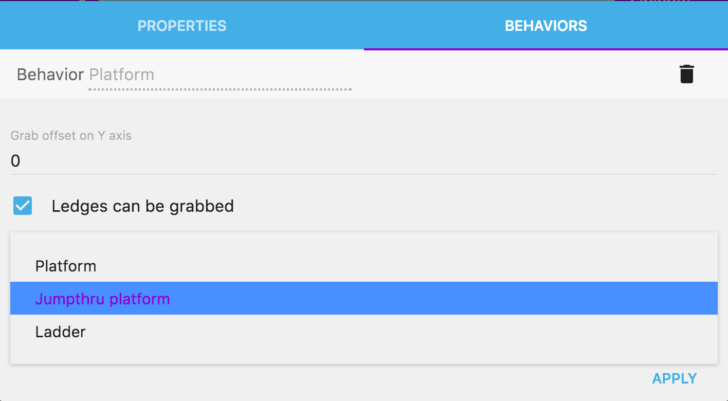 For now, the object is not considered as a platform. Open the object editor and switch to the Behaviors tab. Add the behavior called Platform. Finally, choose "Jumpthru platform" in the list when you click on the "Type" field: