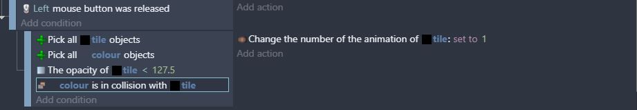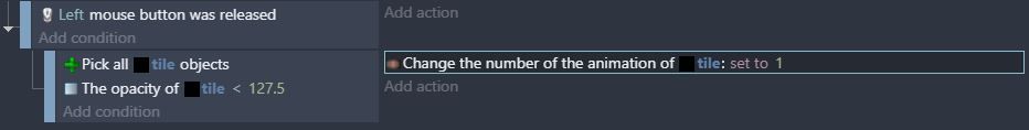 Next, create a new event then give it the condition of the left mouse button released. Then, create a sub event on the mouse button released event with the condition of pick all tile objects and the opacity of tile is \< 127.5. Finally, add an action to change tile animation to 1.