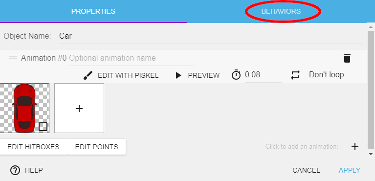 Let's add an animation to the object. Animations are containing images that are displayed on screen for Sprite objects.