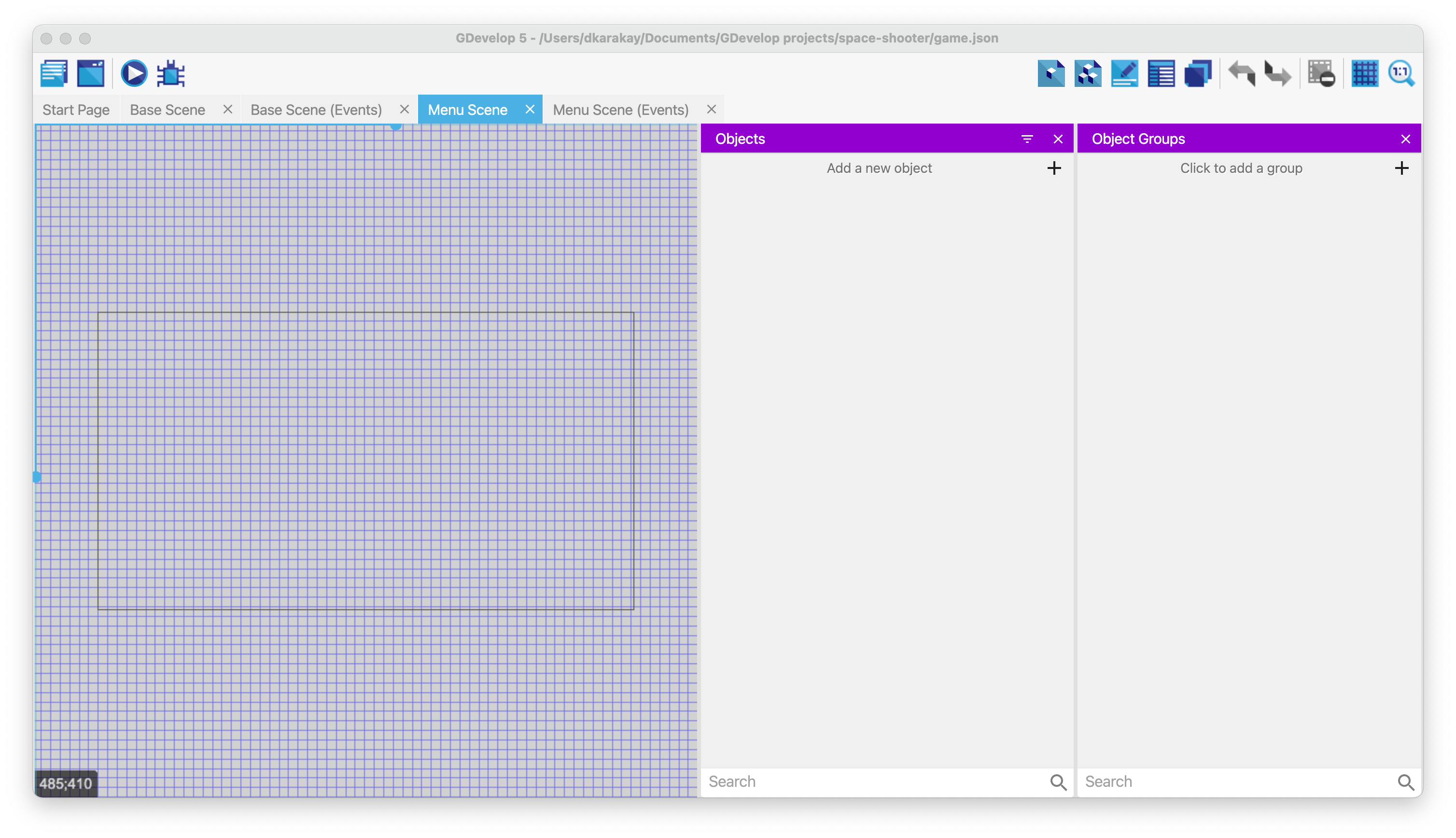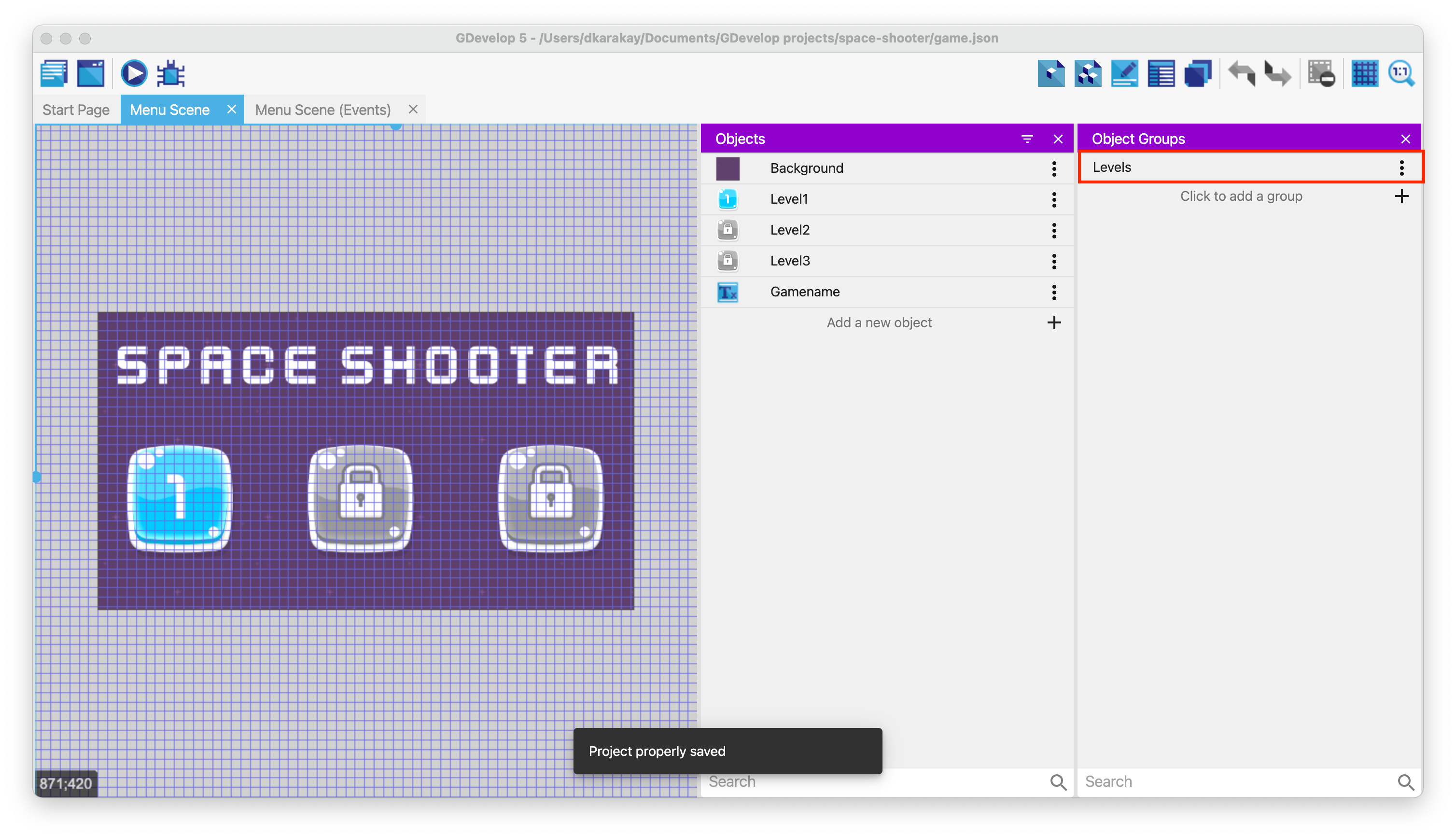 Open the project manager from the upper right corner, and create a new scene called Main Menu.