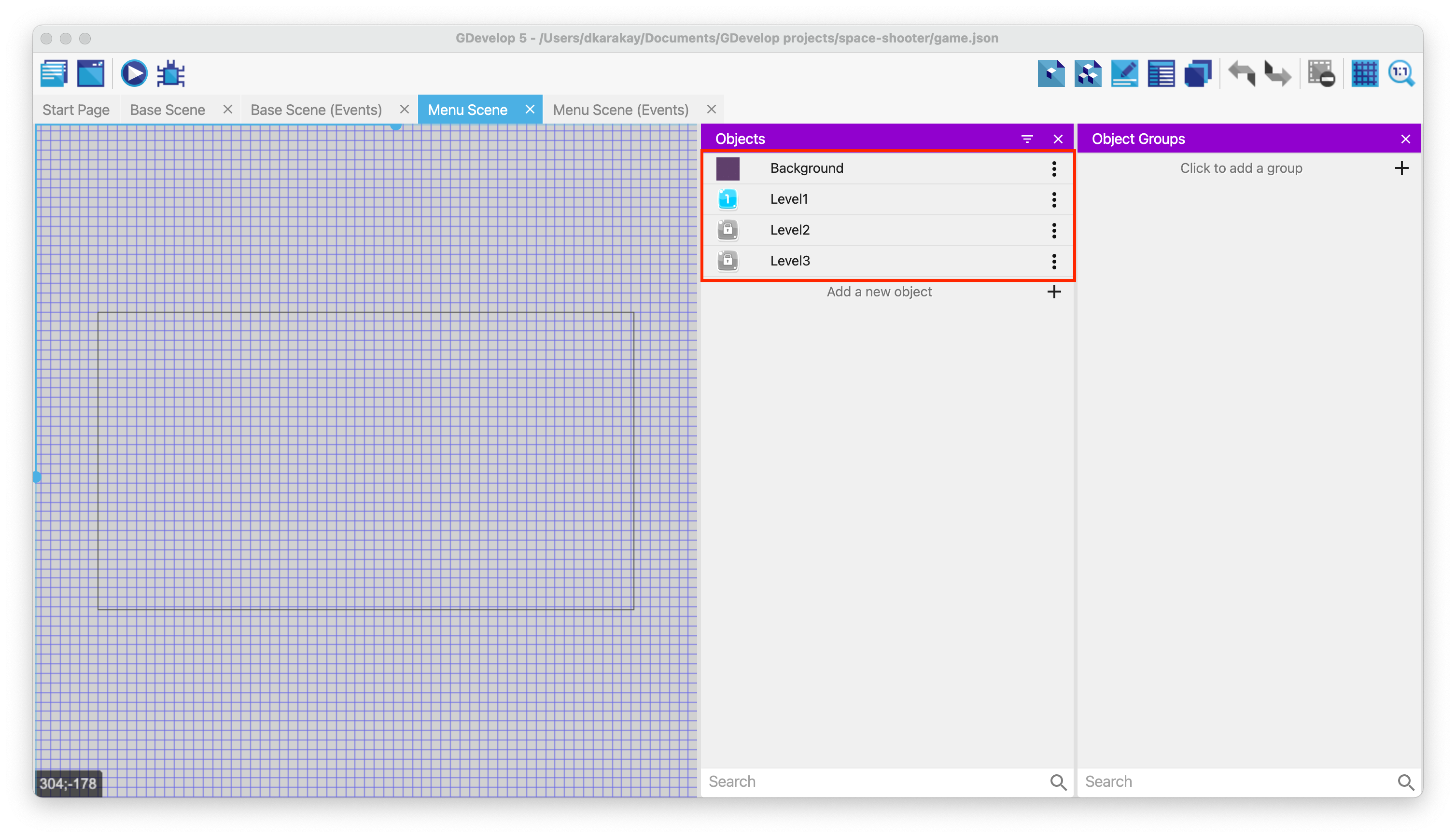 Repeat the last process to add Level3. Then, copy the Background object from Base Scene, as we did in chapter 11 to create explosion effects. In the end, your objects should look like this: