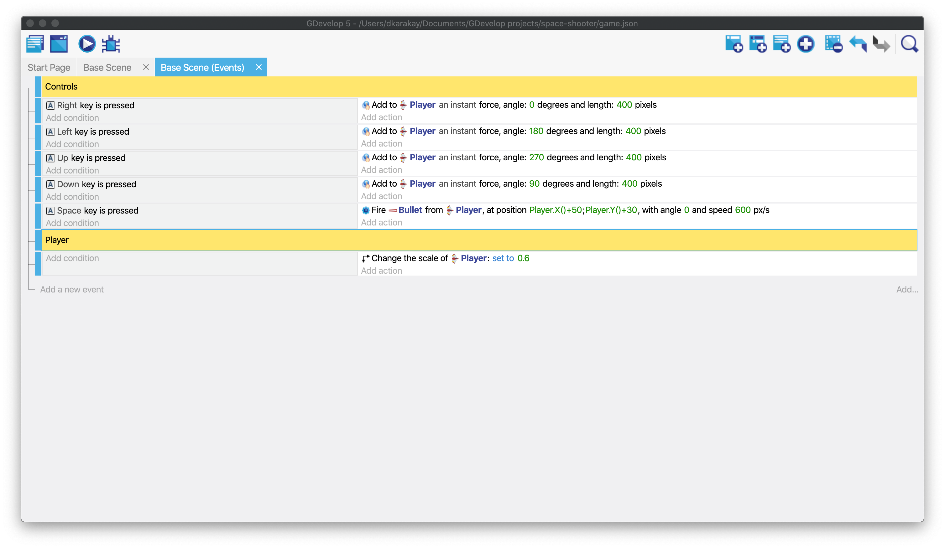 The player spaceship is a bit too big. We could resize it in the scene editor, but for this tutorial we'll use events. Click on Add a new action to change the scale of the player. Then, select the Player and Scale. Fill the value with 0.6.